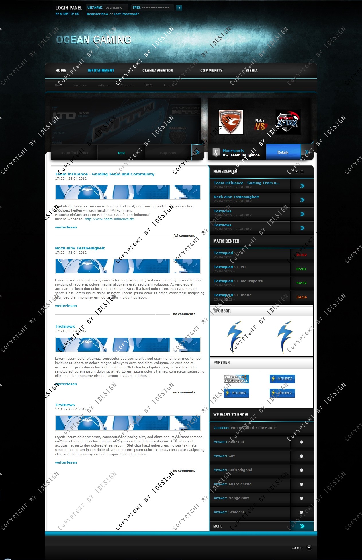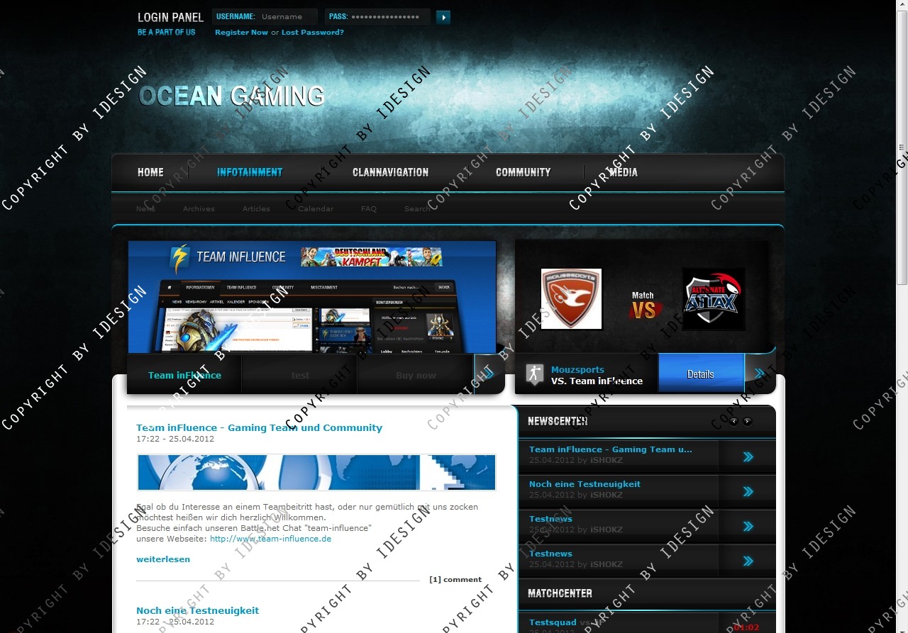 Ocean Gaming ist der Name des professionellen webSPELL Templates. Das Design steht für Professionellität und verzichtet daher eine Überladung von Effekten. Viel mehr setzt es den Inhalt in Szene und betont diesen schlicht, aber keineswegs langweilig.